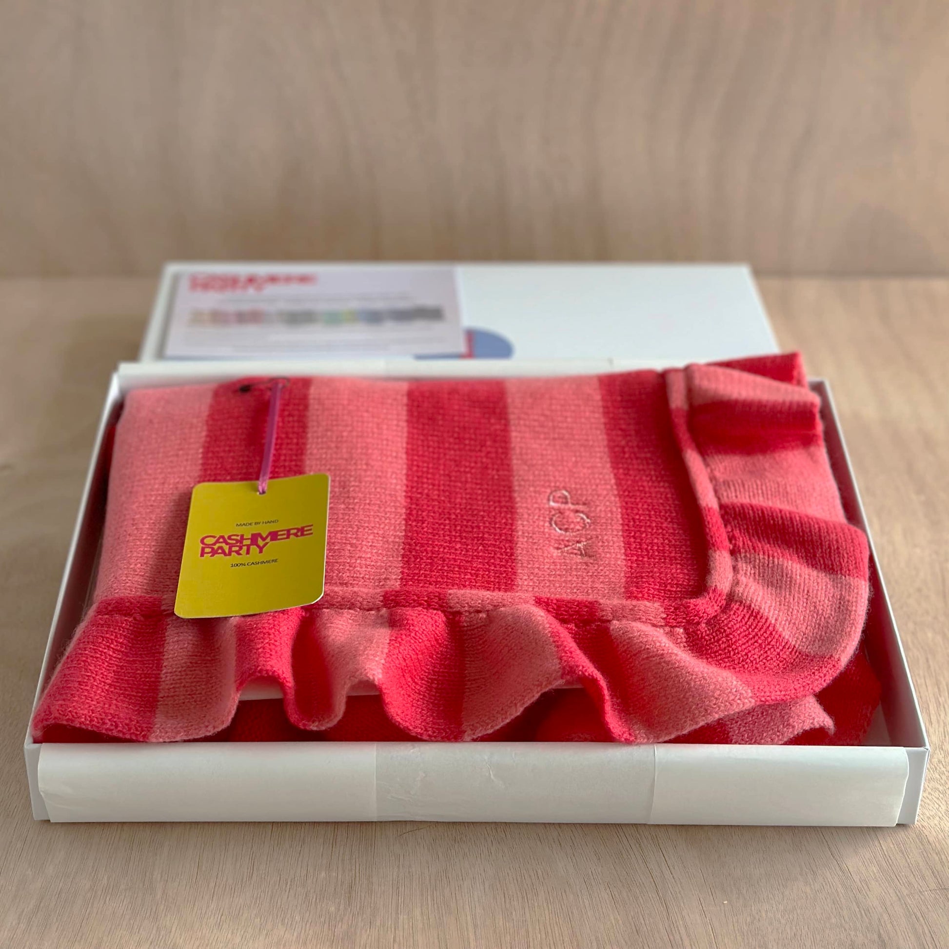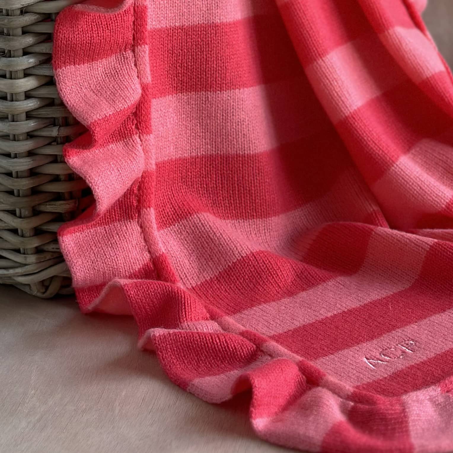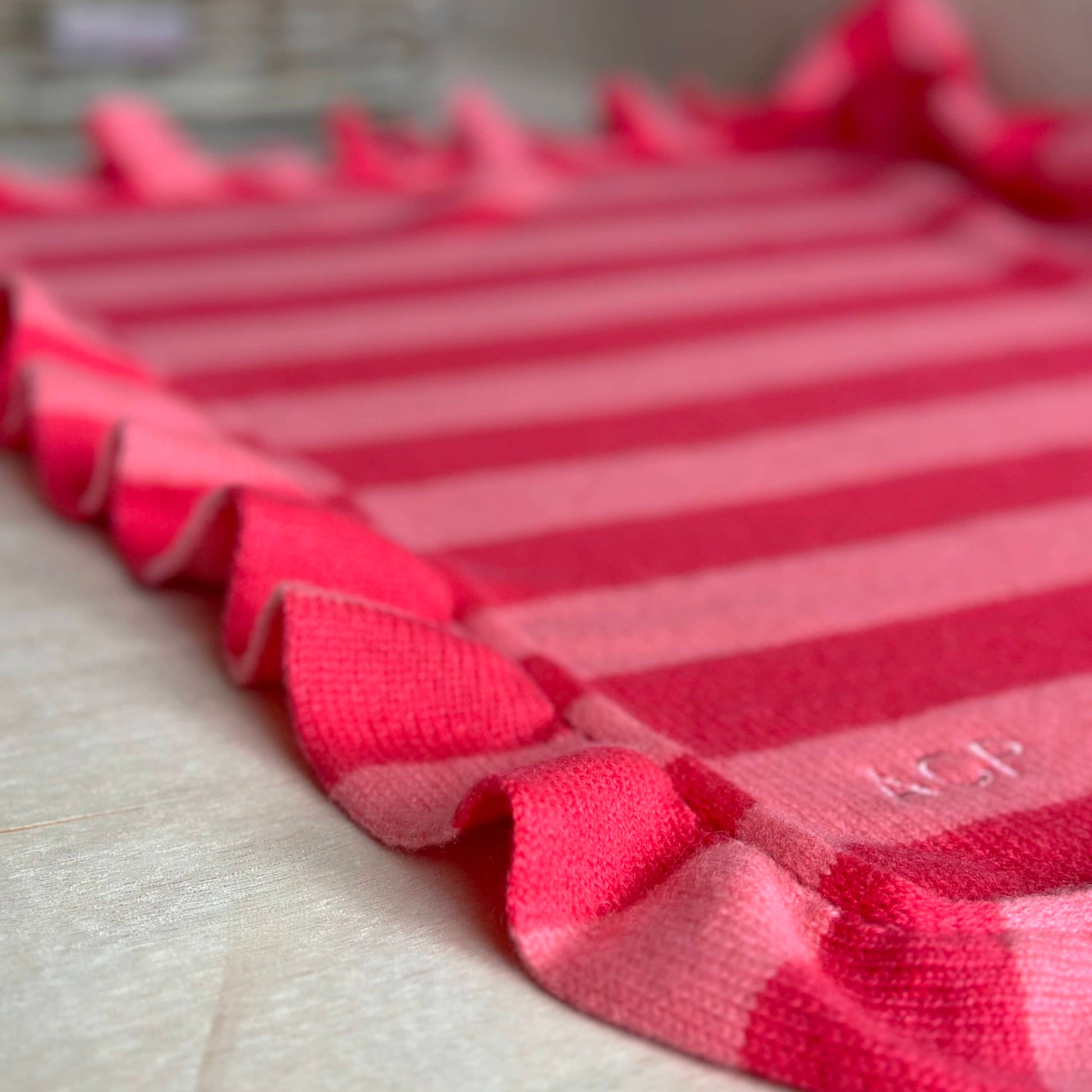 Introducing our frill trim cashmere baby blanket in red and pink. Made with luxurious cashmere, this blanket is perfect for your little one's sensitive skin. The bold stripes add personality and the frill trim adds a playful touch. Personalise it with your baby's initials to make it extra special.
